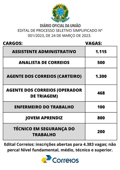 Vagas, editais do Processo Seletivo, Correios: